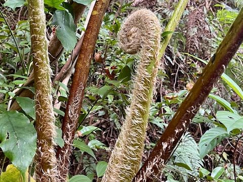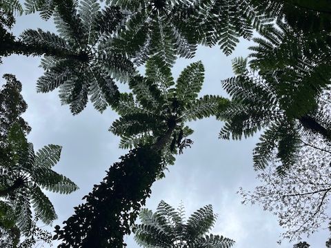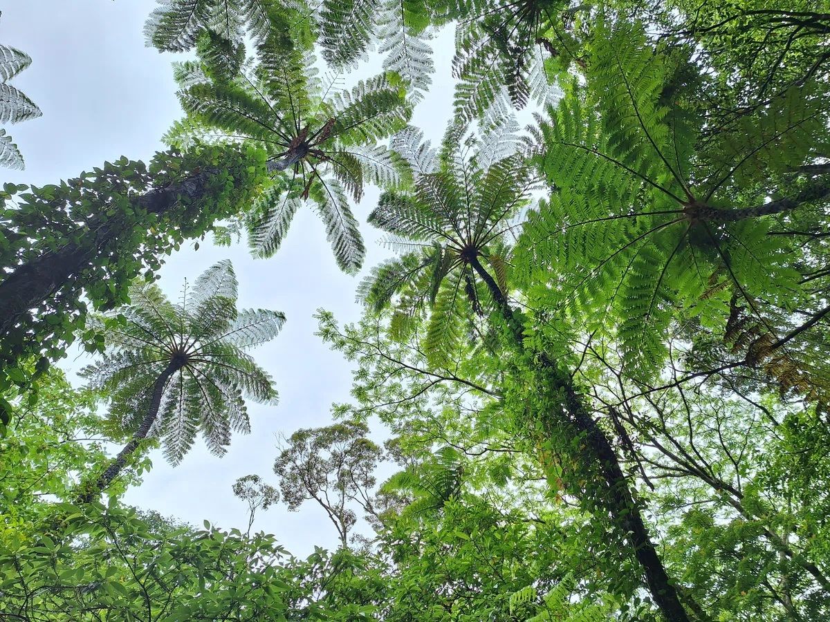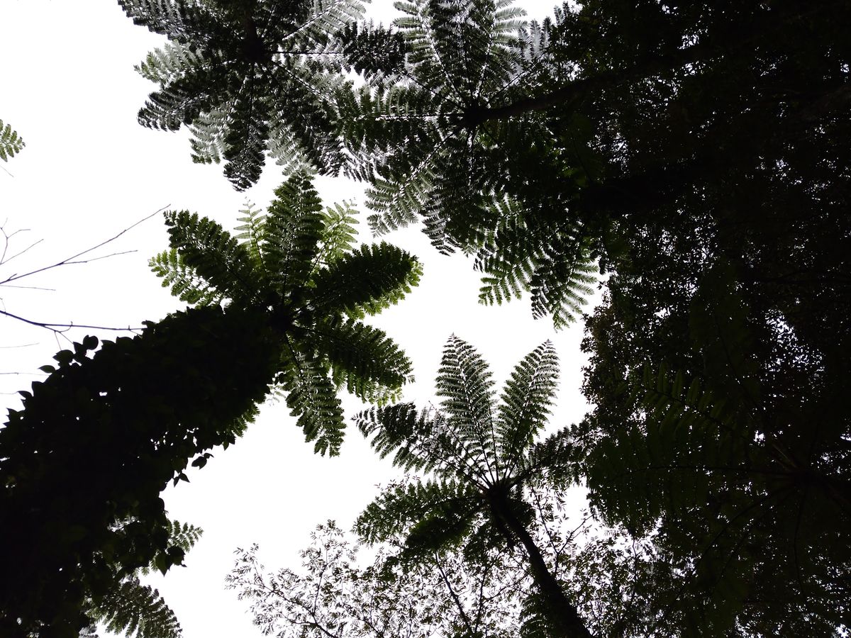 頭上を見上げると、幾何学模様ような葉をした巨大なヒカゲヘゴ