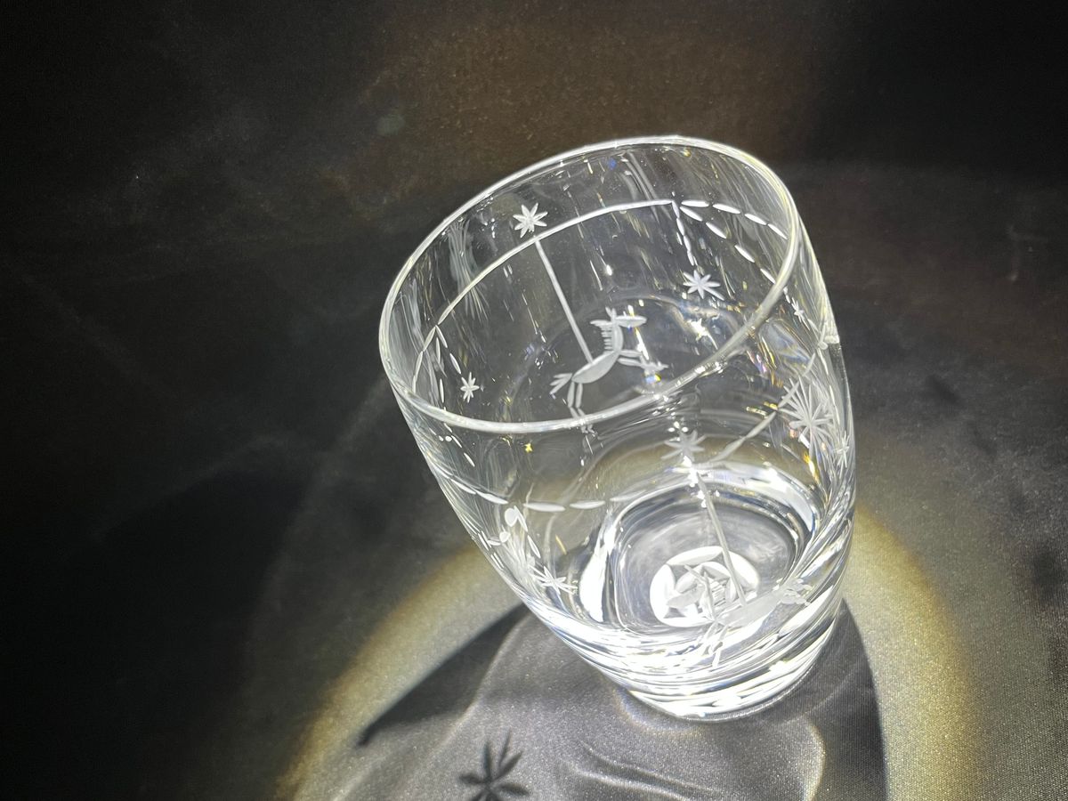押し付けがましくもなく、こちらの希望も聞いてくれて、時間一杯までご指導して下さいました。夫はお魚の柄にクラゲを忍ばせて涼やかな水の世界の切子グラスを。私はサンプルのメリーゴーランドの木馬に一目惚れしてしまったので、メリーゴーランドは難しそうだけど、せめて木馬柄をと思っていたら、講師の方は躊躇せずメリーゴーランドの柄になる様指導してくだいました。二人とも自分なりに納得の出来るグラスが仕上がりました。木馬がユニコーンになってしまいましたがそれもご愛嬌です。帰宅後切子グラスに冷水を注ぎ、すりガラス状態となったグラスを眺めて、今日は楽しかったなあと語り合いました。愛着のあるオリジナルグラスを手に乾杯!もしも破れてしまったら悲しいけど、また創吉で作ればいい!お手頃価格で随分値打ちのある切子体験とグラスと思い出を手にする事が出来ました。
