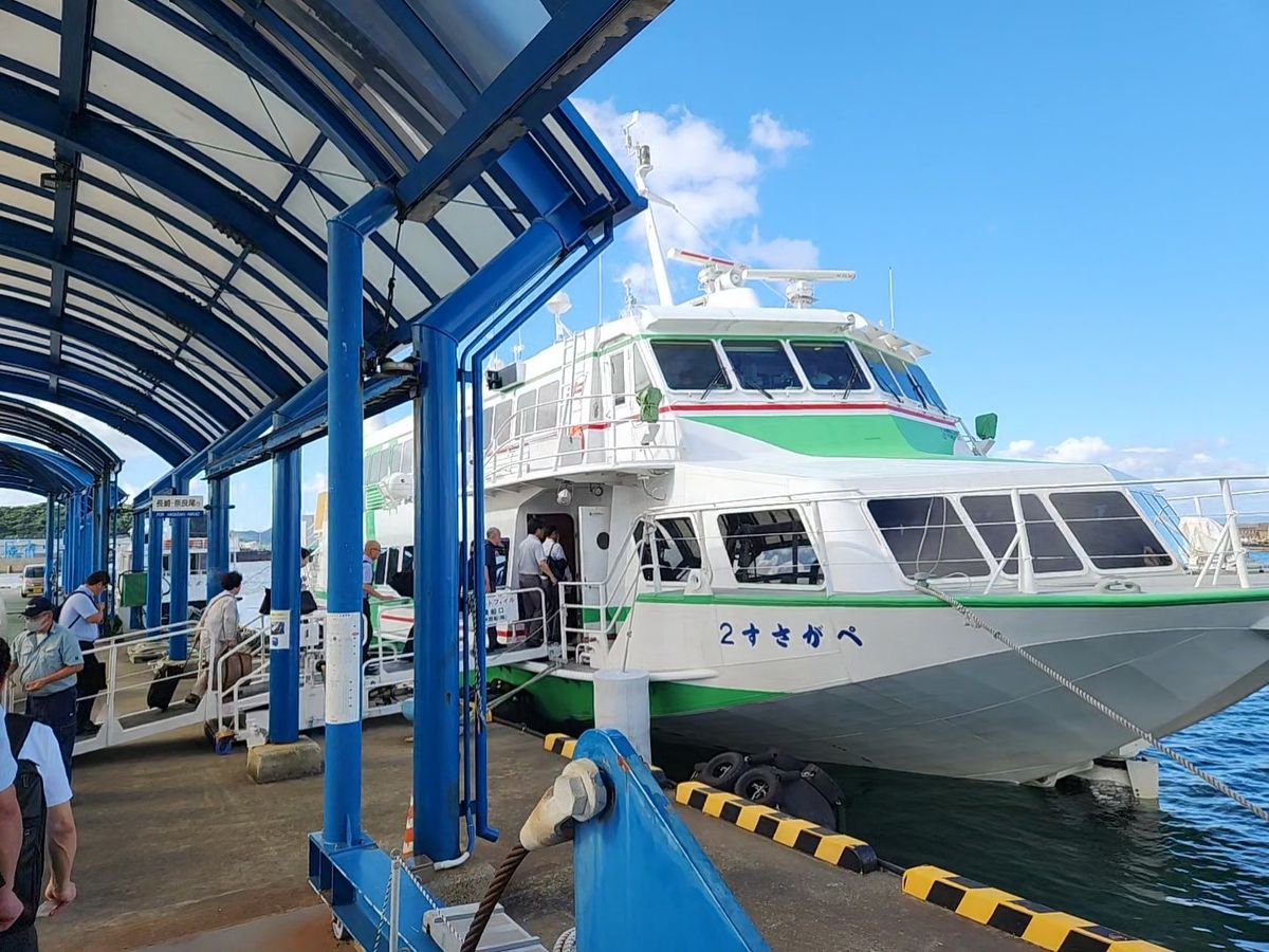 Upon returning to the port, I bought some Oni-saba sushi as a souvenir. It was incredibly delicious. On this day, due to the three-day weekend and flight cancellations, the ferry was almost full. Before I knew it, we arrived at Nagasaki Port. If I had to mention a downside, it would be the poor Wi-Fi connection. After arriving, I walked to the train street and took the bus to Nagasaki Airport from the Oonabashi bus stop.