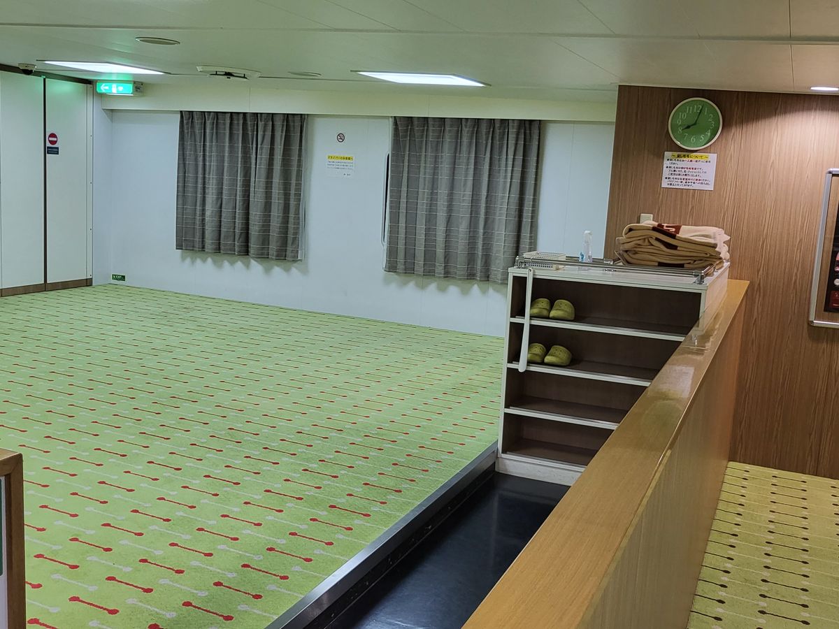 This was my first time on a ferry without any seats; there were only a few carpeted areas. I was a bit surprised to see all the other passengers immediately lying down as soon as we set sail! I borrowed a blanket and a pillow and lay down as well. However, even though it was said to be a relatively calm day, I was still battling seasickness while lying down, which was tough for someone unaccustomed to it. Thankfully, since my boarding number was in the single digits, I was able to secure a position where I could lean against the wall, which was a relief.