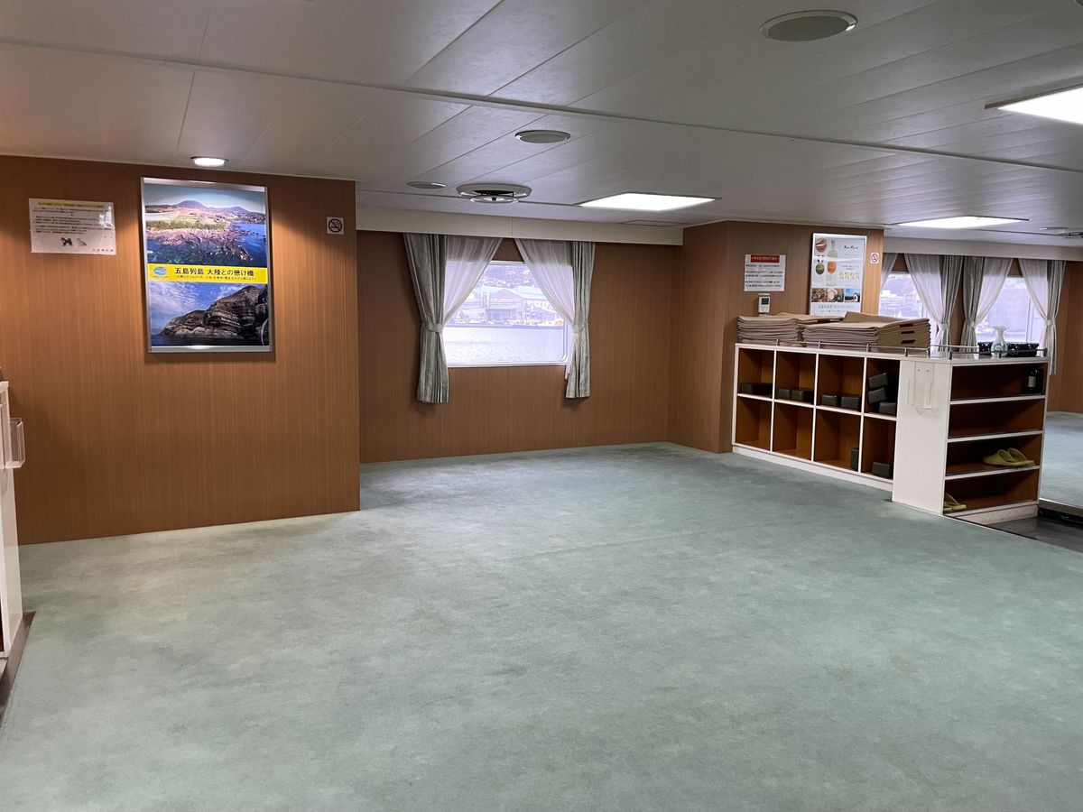 ターミナル内のチケット売り場で、バウチャーのスクショを見せるとすぐ乗船券に引換えてもらえ、簡単チェックインでした。高速船と迷ってフェリーにしましたが、船酔いもせず寝てたらあっという間に福江島に着きました。時化のときは高速船よりフェリーの方が欠航になりにくいとのことで、復路もフェリーにしました。下船時に乗船券は回収されますので、捨てずに保管してください。