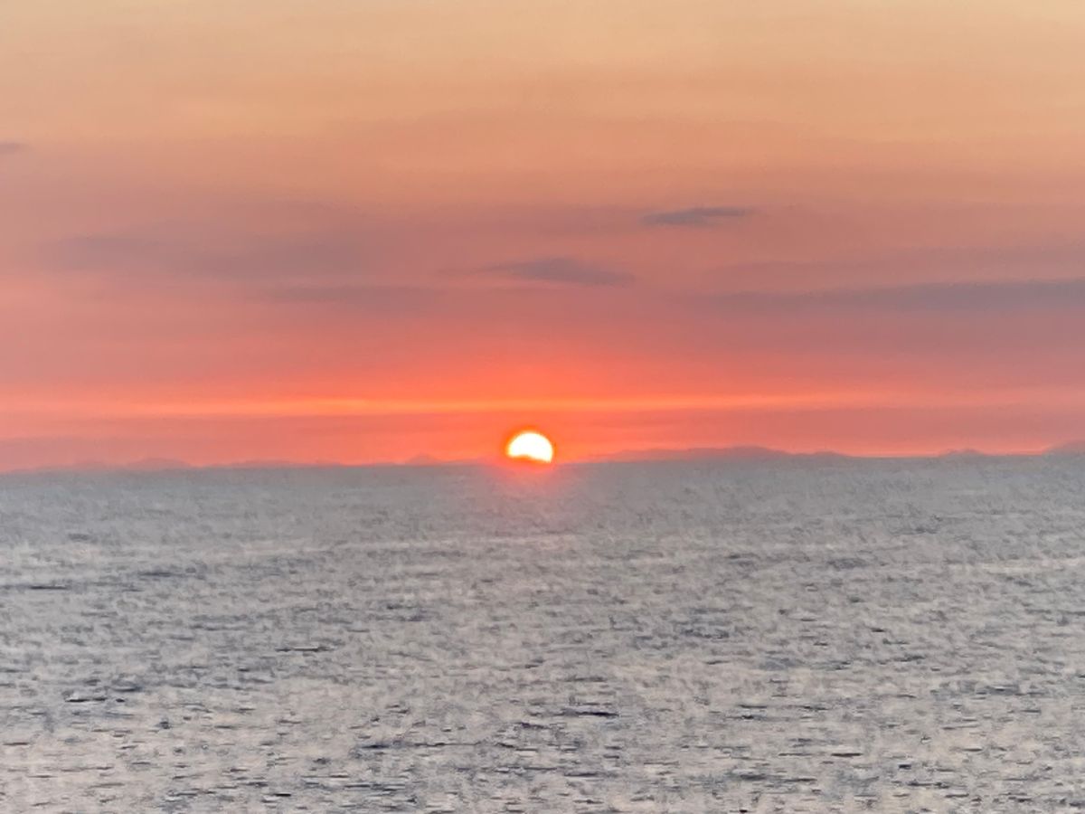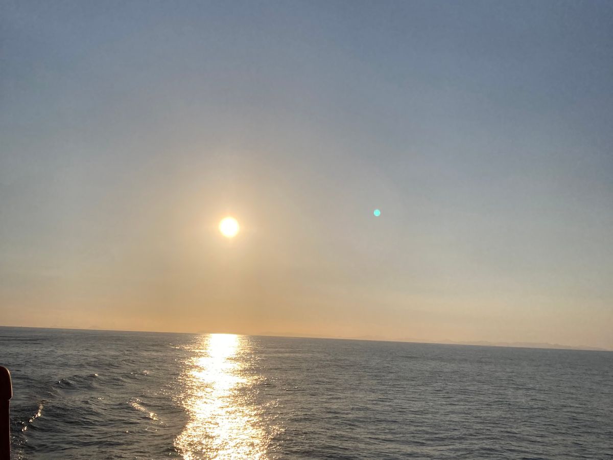 福江島から長崎の帰りにフェリーに乗船しました。行きはジェットフォイルに乗りましたが、帰りは海に沈む夕陽を甲板から眺めたくてフェリーにしました。期待通りの素晴らしい夕暮れを観る事ができ、感動しました。