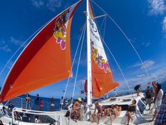 The Spirit of Aloha is a 54 ft sailing catamaran with onboard restrooms and ample seating for up to 49 guests