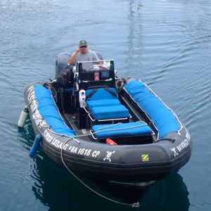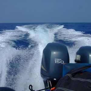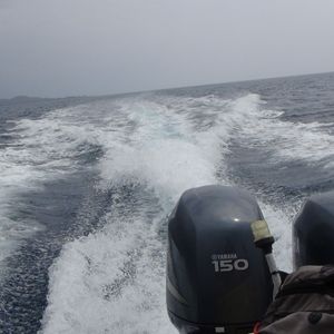 出発すると、まもなく湾の中をゆったり泳ぐ亀に出会いました。外海にでると、150馬力2機のエンジンで、軽いゴムボートを簡単に20ノット(約37km/h)までスピードアップします。