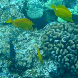When we arrived at Captain Cook's Cove, we were given life jackets and cylindrical floaties since neither of us could swim. At first, I was just floating leisurely and looking at the surface of the sea when suddenly I saw a beautiful coral reef. Upon closer inspection, I noticed real, colorful tropical fish swimming around the reef. I became engrossed in observing the tropical fish and found an angelfish.