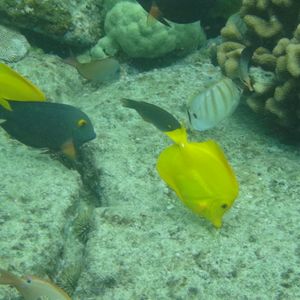 最初、適当にのんびりプカリと浮きながら海面を見ていたら、突然綺麗なサンゴ礁が見え、よく見ると、本物の色とりどりの熱帯魚がサンゴ礁の周りを泳いでいるのが見えました。夢中になり熱帯魚観察をしているエンゼルフィッシュを見つけました。