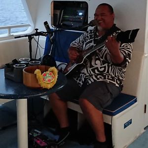 The boat sways quite a bit, so at first, it's hard to walk, but during meal times, we anchor offshore, so you can relax. Moreover, at that time, a manta ray and many dolphins gathered around. I think they must have liked the singing. I can't remember the name, but there was a singer with the most beautiful voice singing live the whole time, and songs that felt very Hawaiian, which was truly soothing.
