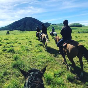 Upon arriving at the horseback riding location, there was an explanation in English. It was something like, "When turning right, pull the reins to the right..." My 8-year-old daughter was scared because she is small, but she was trying her best since she couldn't ride with me. We rode for over an hour, and by the end, my legs were definitely tired.