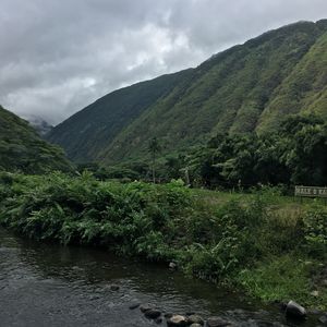 After changing to a different vehicle from the meeting point, we arrived at the Waipi'o Valley lookout. From there, the road continued to descend steeply. It was quite bumpy, and we crossed a river along the way. I'm glad we didn't have lunch right before; we would have definitely gotten car sick.