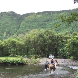 We participated with two adults and two children for our first horseback riding experience. We took a four-wheel drive microbus down to the bottom of Waipi'o Valley from the meeting point. The guide provided explanations in English, but it's okay if you can't catch everything. The stunning views of the valley and the movement of the vehicle going down the steep slope felt like a little attraction, which was enjoyable. Upon arrival, the guide explained how to ride the horses in English and some broken Japanese. Although I felt a bit anxious, I could understand somewhat through gestures, and the horses were well-trained, so we could ride without any issues. After that, we rode in a line through the valley, passing taro fields and waterfalls. As we got more comfortable, it felt like we were able to control the horses ourselves, making it a very enjoyable experience. While it might be a bit lacking for experienced riders, our family, who are all beginners, was completely satisfied with the experience.