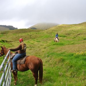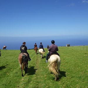 集合場所は、観光名所に見かける大きな案内の看板がある訳ではなく普通の牧場の建物なので、少々わかりにくいところもありましたが、カーナビを頼りにどうにか到着。日本語で書かれたごく簡単な乗馬ガイドを一読した後に、ヘルメットをかぶりすぐ馬に跨って出発。この日は我々二人と女性ガイドの3人だけでした。馬はよく訓練されていて、こちらが特に何かやらなくてもあらかじめ決められたコースをゆっくりと歩いて進んでいく感じで特に危険は感じませんでした。海と山の絶景に囲まれた広大な丘陵地の牧場をのんびりと一時間以上の乗馬。途中で牛や羊の群れとも出くわします。日本では絶対にできそうもない体験でとてもお勧めです。