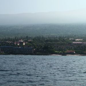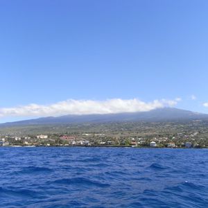 We sped across the water to Keauhou on the boat. Hats flew off, so it was impossible to wear one, and the speed made it feel like we might be thrown into the sea if we didn't hold onto the boat's railing. Occasionally, we stopped for explanations in English about Hawaii, the ocean, and the mountain scenery.