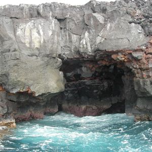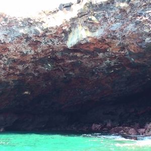 On the boat, we could snack on fruits like pineapple and have drinks to satisfy our hunger a bit. Then, on the way back, we observed lava caves, but the caves weren't very deep, so it didn't feel like we were entering them. Still, the captain explained various things (in English), including the lava that represents the sleeping form of the fire goddess Pele and how the lava was formed.