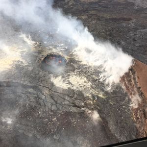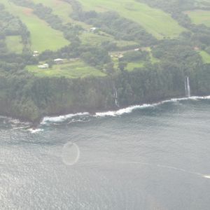 今、キラウエアの活動は小康状態のようで、オレンジ色の火口はなかなか見ることができないのですが、パイロット(この日はアメリカ人)はヘリコプターを右旋回、左旋回と操り、左右いずれの席からもよく見えるよう、丁寧な操縦をしてくれました。添付した写真は拡大してみるとオレンジ色の火口が見えます。