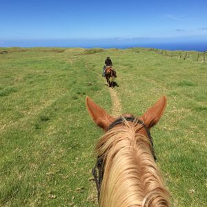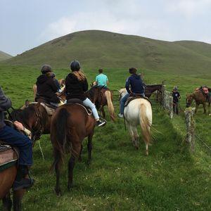 午前中の1時間半のプランで、初心者ばかりの家族で申し込みしました。牧場まではレンタカーで向かいました。目印の看板はシンプルで見落としがちです。一本道なので通り過ぎるとUターンが難しいです。3月は少し肌寒く、天気は薄曇りでした。予約している名前を告げると、ヘルメットとジャンパーと貴重品を入れるウエストポーチを貸してくださり(無料)、簡単な手綱の使い方を教わると、インストラクターのお姉さんの引率で即出発です。360度見渡す限り高原で、清々しい気持ちになります。天気が良いと海まで見られたかもしれませんが、あいにくの曇り空で霞んでいて見えませんでした。馬は大人しく、途中草を食べながらゆっくり進みますので、初心者の方でも安心して参加できると思います。オアフ島のクアロアランチも良いですが、広々とした草原はハワイ島ならではないでしょうか。