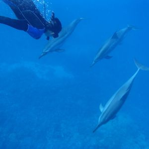 主人と2人で参加しました 「イルカと泳ぐ」という長年の夢をやっと果たせました!少し近寄れば触れそうなところを悠然とイルカの群れが泳いでいくのです!かわいい子供イルカもいました いっしょに遊ぶことはできませんが、イルカたちの声も聞けてとても嬉しかったです