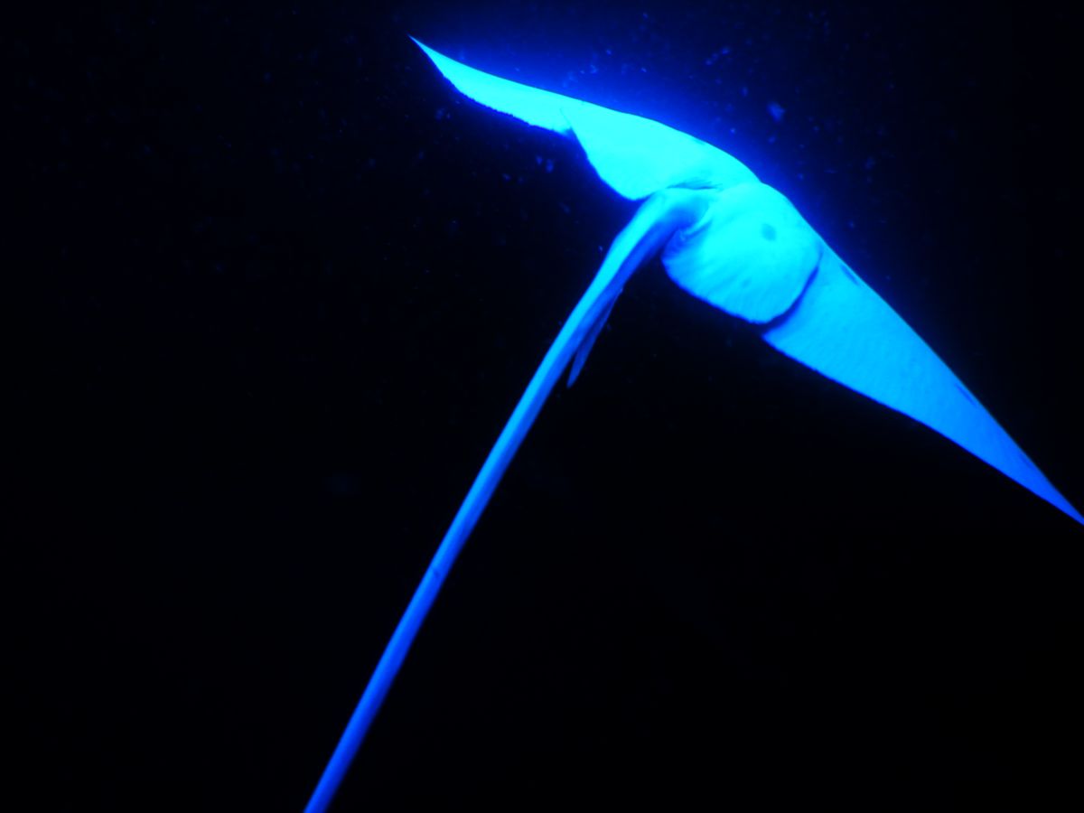 そしてマンタと遭遇するタイミングが早い早い。みんなで捕まる用のSUPボードのLEDライトを点けるとすぐにマンタが寄ってきました。