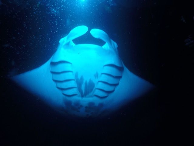 ウェットスーツ、足ひれ、ゴーグルをつけ筏のロープに腕を伸ばした状態でつかまり浮いていると筏のブルーライトに寄ってくるプランクトンめがけて3メートル大のマンタが斑模様のおなかを見せながら大きな口を開けて私たちスレスレに何度も回転する様子には、あまりの迫力にただただ圧倒され感動するばかりでした。本当に貴重な感動体験ができました。