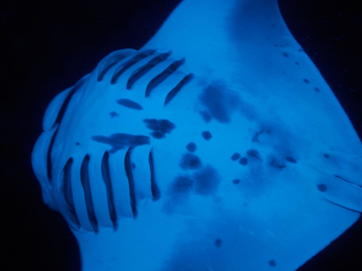 出港して30分ほどでポイントに到着。光を放つサーフボードのような浮きを海に浮かべ、マンタが寄ってくるのを待ちます。マンタが近づいてきたのを確認し、みんなで水に入り浮きにつかまりながら顔を水につけてマンタを見学。マンタはくるくると旋回しながら光に近づいては離れ、を繰り返しますが、かなり近くまでやってくるので迫力満点。この日は7~8回マンタが私たちの浮きに近づいてきました。夜の海は水が冷たく体が冷えるのであまり長く水中にいられないため、少ししか見られないこともあるようですので、私たちはラッキーでした。