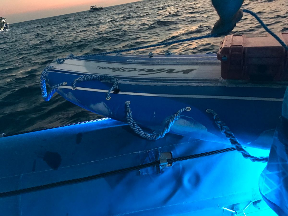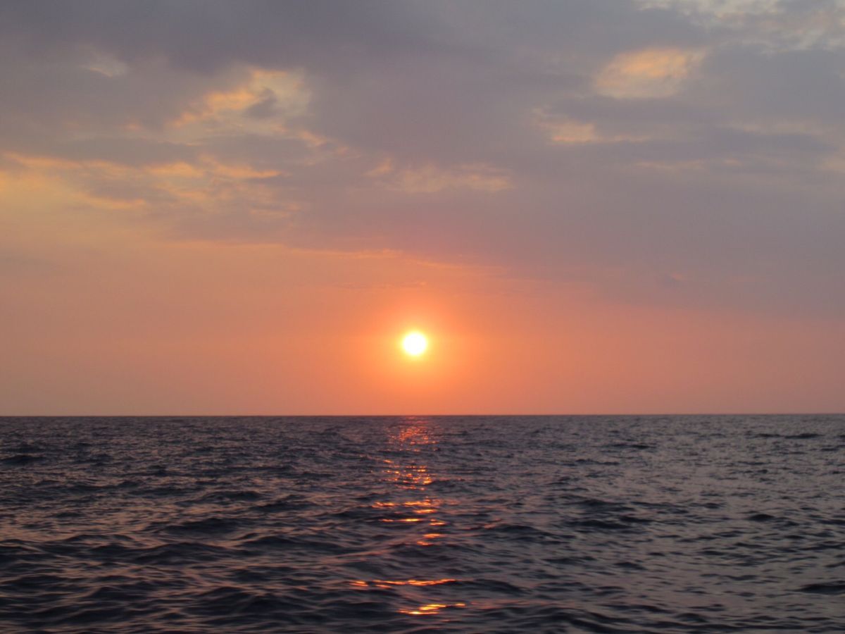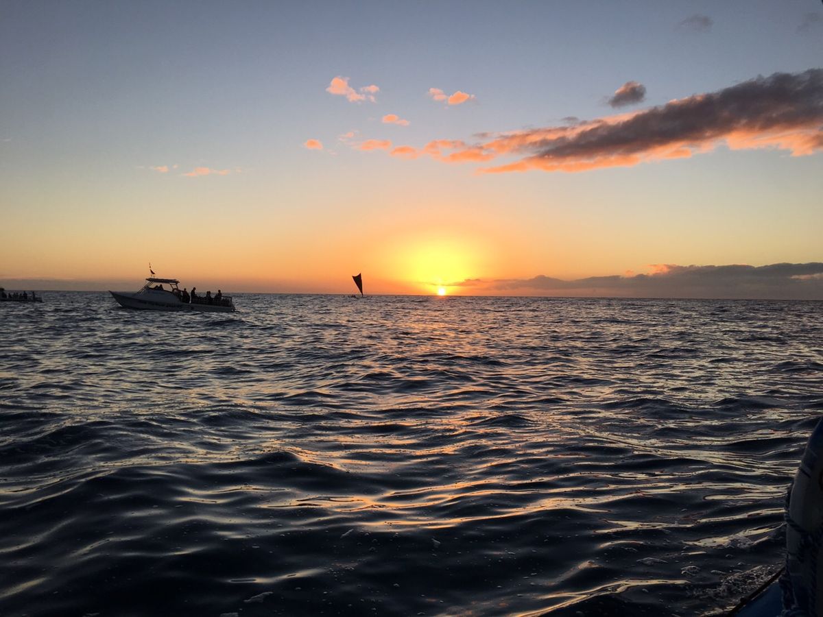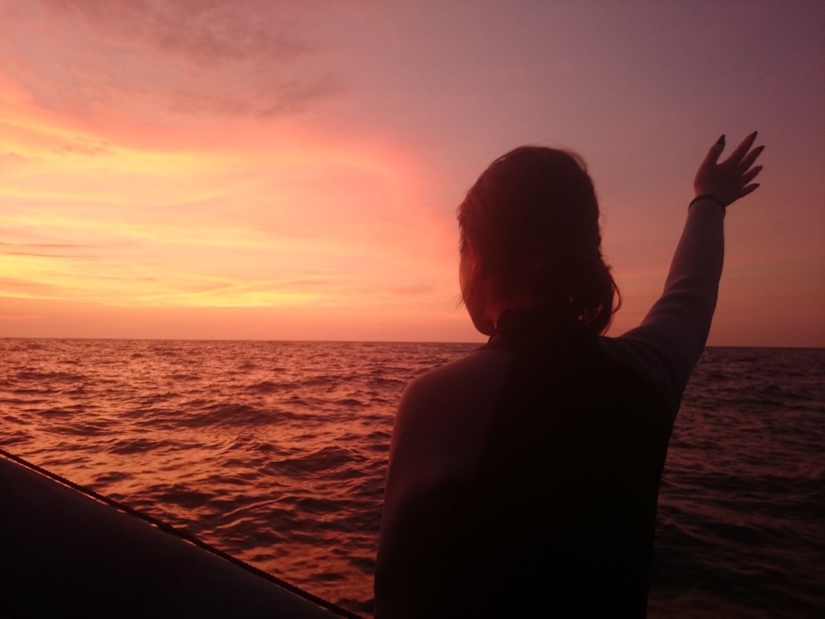 まず、小さなボートに乗って沖へ出ます。スピード感がスリリング‼ボートから見る夕陽は絶景です。