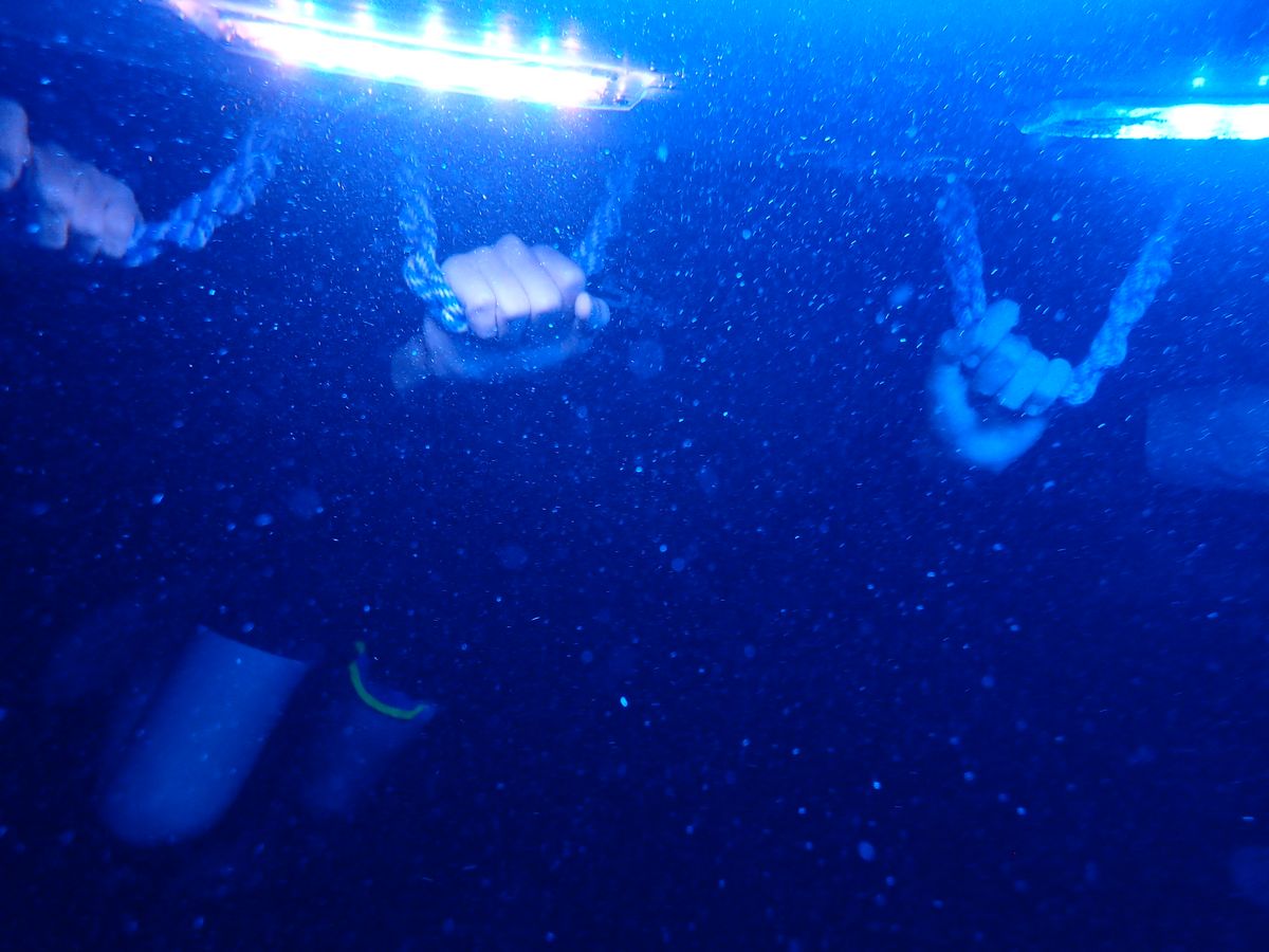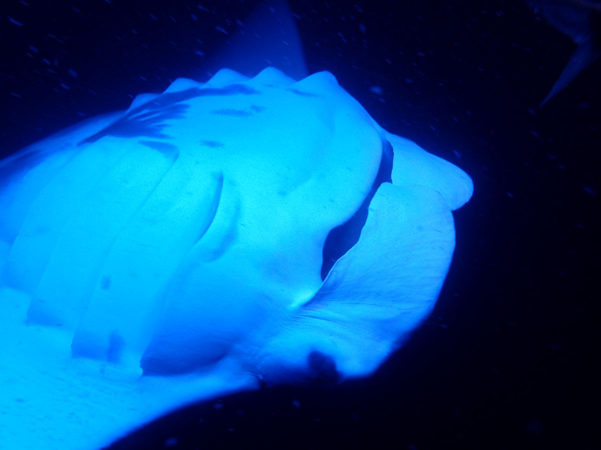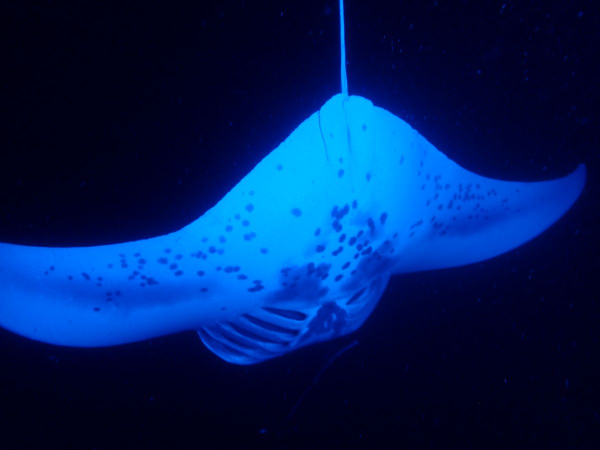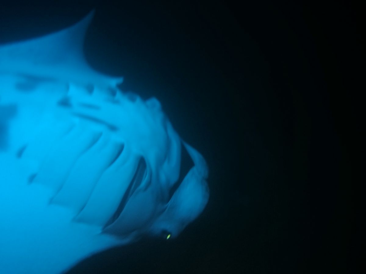 陽も沈みすっかり暗くなった頃に、観測スポットに到着。みんなでボードに掴まり、プカプカと浮きながらマンタを待ちます。待つと書きましたが、ボードの下の光に引き寄せられ、すぐにマンタが寄ってきます。自分のお腹下スレスレを通るマンタに大興奮♪夜の海で、ゆったりと優雅に舞うマンタは神秘的です。マンタの写真もバッチリ撮れて、大満足!!!