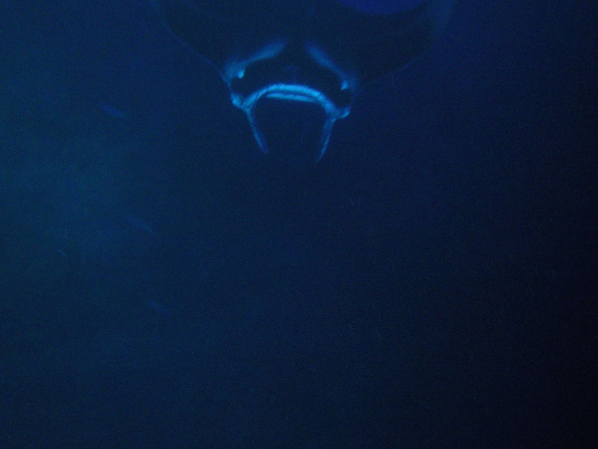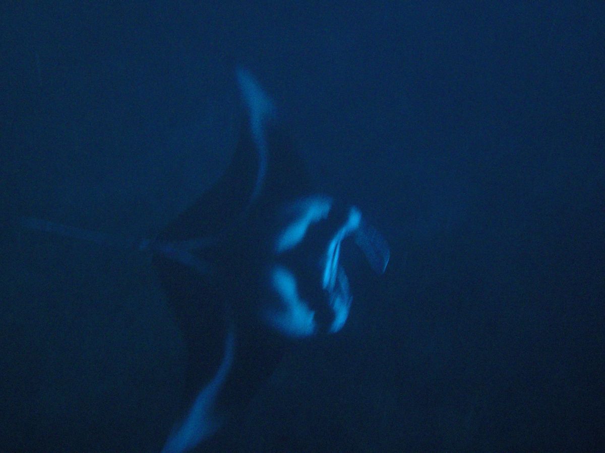 私たちの捕まるビート板の(LEDライトの光に群がる)プランクトンめがけて、マンタがやってきました!