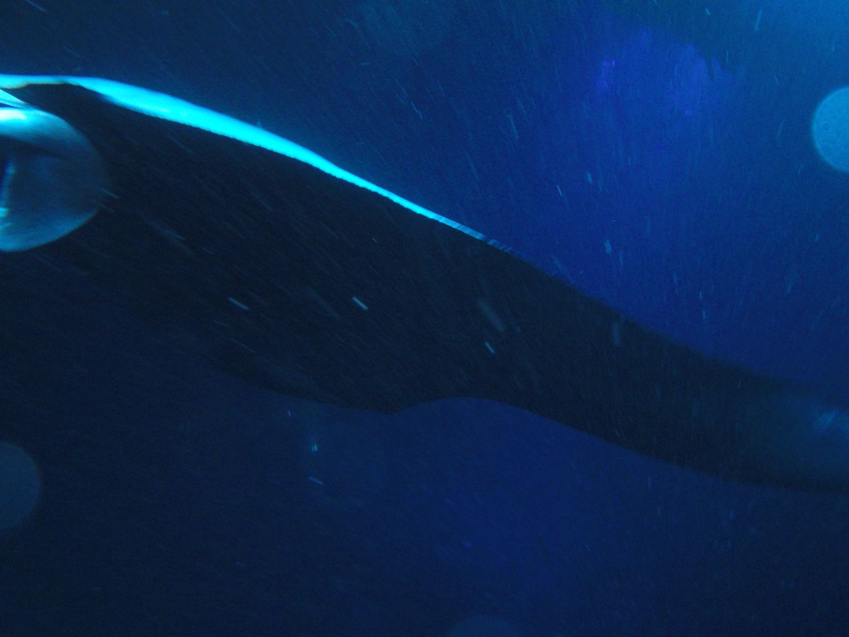 マンタのポイントまでは船で20~30分程度。ポイントに到着するとLEDライトのついたビート板に捕まり海をプカプカ(LEDライトの光にプランクトンが寄ってきて、それをマンタが食べに来る)。10分程度すると光に寄ってきたプランクトンで海中は濁ります。「視界が悪くなってきたなぁ...」と思った瞬間、足元にはマンタが!