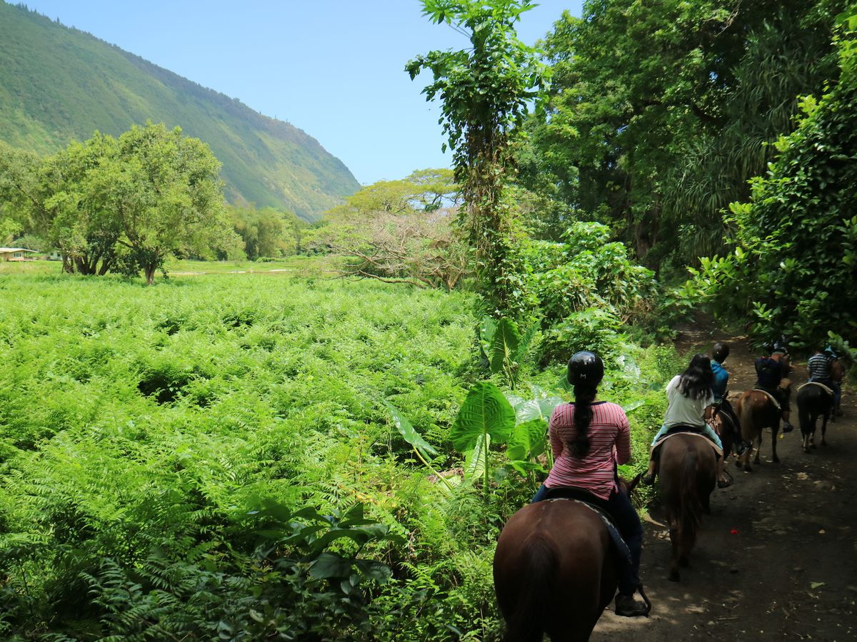 集合場所から4駆のマイクロバスのような車に乗ってワイピオ渓谷の下まで降りていきます。ガイドさんが英語で説明をしてくれますが聞き取れなくても問題ありません。渓谷の素晴らしい景色と超急坂降を下る車の動きがちょっとしたアトラクションのようで楽しめます。下に到着するとガイドさんが馬の乗り方について英語と片言の日本語で説明してくれます。ちょっと不安に思いますが身振り手振りでなんとなく理解できることと、馬が十分に調教されているので問題なく乗ることが出来ます。その後一列になってタロイモ畑や滝を見ながら渓谷の中を巡ります。慣れてくると自分で馬をコントロール出来ているような気がしてとても楽しく過ごせます。乗馬経験者には少し物足りないかもしれませんが、未経験の私たち家族は全員大満足の体験でした。