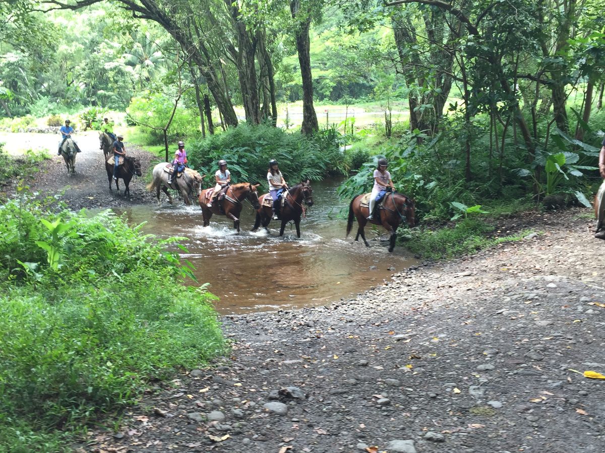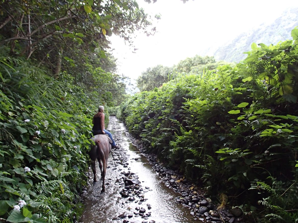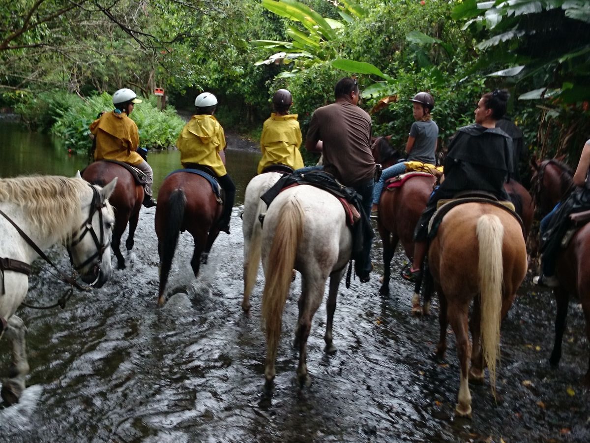 初回の参加は2年前で、ホテルのコンシェルジェに薦められて参加しました。乗馬経験も無く英語もダメな私たちですが、参加してみたら最高に楽しいアクティビティだったので、今回で2回目の参加です。前回と同様、私たち2人以外はすべて欧米人でしたが、全く問題ありません。説明は英語ですが、なんとなく雰囲気はわかると思います。それと厩舎の壁に日本語の説明書きが貼ってあるので、馬の乗り方はそれでわかると思います。1回あたり12人位のグループの先頭と最後尾にガイドさんが1人づつ付いて渓谷を約1.5時間の乗馬散策です。今回乗った馬は「ロッキー」という10歳の牡馬で、グループのリーダー格のようで、常に先頭のガイドさんの次を歩いていました。そのため、ガイドさんの英語がわからないながらも、説明をよく聞くことが出来ました。ワイピオ渓谷の自然の中で、時には川の中をジャブジャブと馬のお腹まで水に浸かりながら散策できるという、すばらしい体験ができるアクティビティなので2回、3回と行きたくなるくらいお薦めです。それと、最後に車を降りるときに、欧米人たちはガイドさんにチップを渡していたのでお忘れなく。私たちも2人で30ドルのチップを渡しました。
