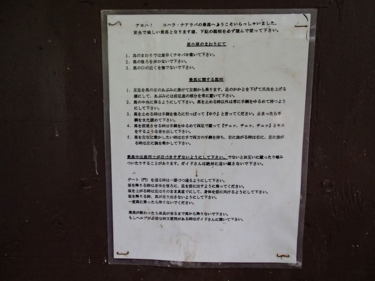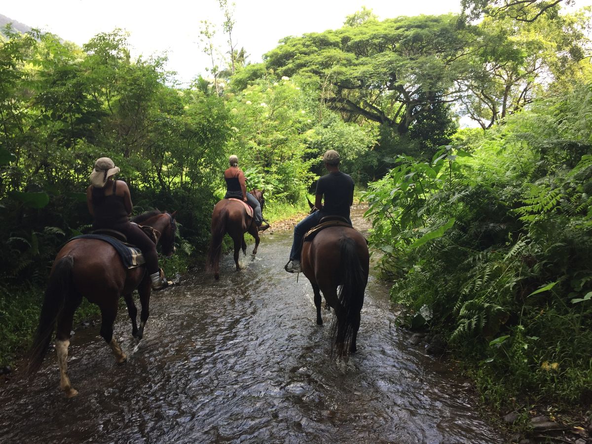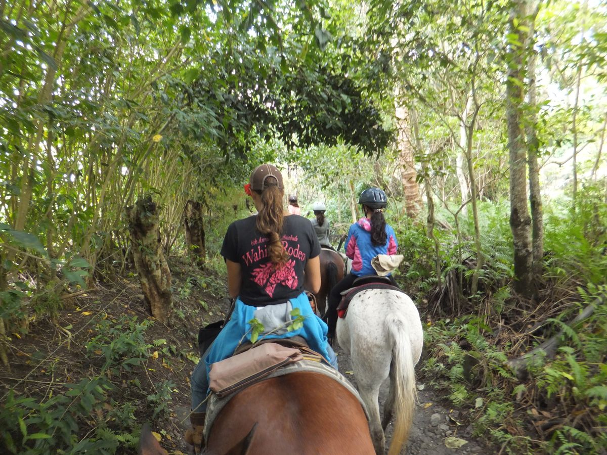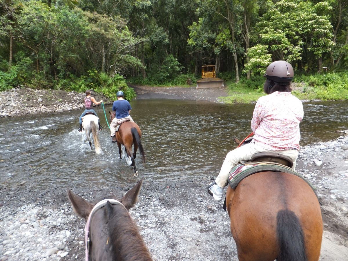 初回の参加は2年前で、ホテルのコンシェルジェに薦められて参加しました。乗馬経験も無く英語もダメな私たちですが、参加してみたら最高に楽しいアクティビティだったので、今回で2回目の参加です。前回と同様、私たち2人以外はすべて欧米人でしたが、全く問題ありません。説明は英語ですが、なんとなく雰囲気はわかると思います。それと厩舎の壁に日本語の説明書きが貼ってあるので、馬の乗り方はそれでわかると思います。1回あたり12人位のグループの先頭と最後尾にガイドさんが1人づつ付いて渓谷を約1.5時間の乗馬散策です。今回乗った馬は「ロッキー」という10歳の牡馬で、グループのリーダー格のようで、常に先頭のガイドさんの次を歩いていました。そのため、ガイドさんの英語がわからないながらも、説明をよく聞くことが出来ました。ワイピオ渓谷の自然の中で、時には川の中をジャブジャブと馬のお腹まで水に浸かりながら散策できるという、すばらしい体験ができるアクティビティなので2回、3回と行きたくなるくらいお薦めです。それと、最後に車を降りるときに、欧米人たちはガイドさんにチップを渡していたのでお忘れなく。私たちも2人で30ドルのチップを渡しました。