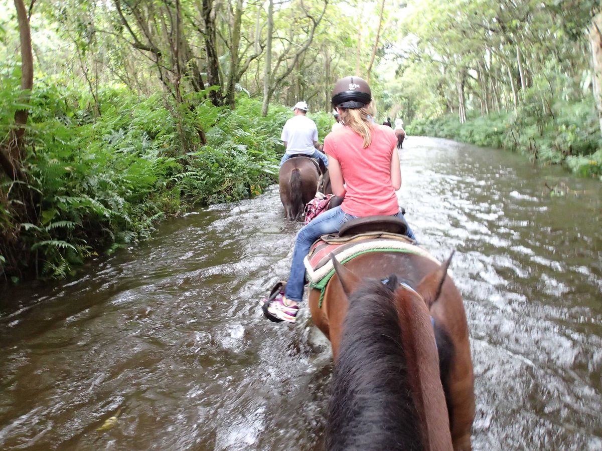 毎年恒例のハワイ家族旅行。今回は、夫婦2人で参加しました。乗馬はハワイでの恒例オプショナル。今回はナアラパ・ステープルズを初めて利用しました。乗馬は、たいていお利口さんなよく人に慣れた馬が1列になって黙々と…というのが常な印象でしたが、このコースはおもしろい!!チョロチョロと流れる川を横切るだけでなく、「川って、ここを行くのっ!?」と馬の腹まで浸かるほどの水深をジャブジャブ。途中で野生の馬に遭遇したり、ガイドさんが花を髪に飾ってくれたりと、スリリングでとてもおもしろかったです。牧場の番犬たちが、一緒にツアーコースを回ってくれたのも何とも愛らしいです。
