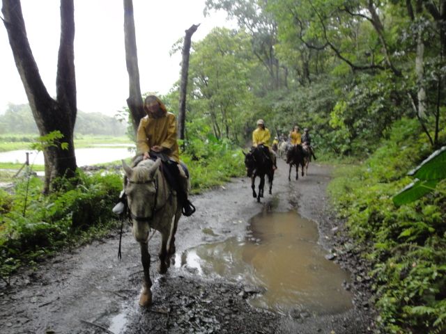 Even with quite a bit of rain, the ride doesn't get canceled. They lend you raincoats, but some raincoats only cover the upper body, so my pants got completely soaked. The color from the saddle transferred onto my pants.