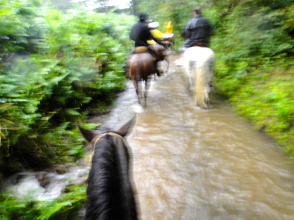 ?けっこうな雨でも中止にはなりません。カッパは貸してくれますが、カッパによっては上半身だけのものもあるので、ズボンがびしょぬれになりました。ズボンに鞍の色が移ってしまいました。
