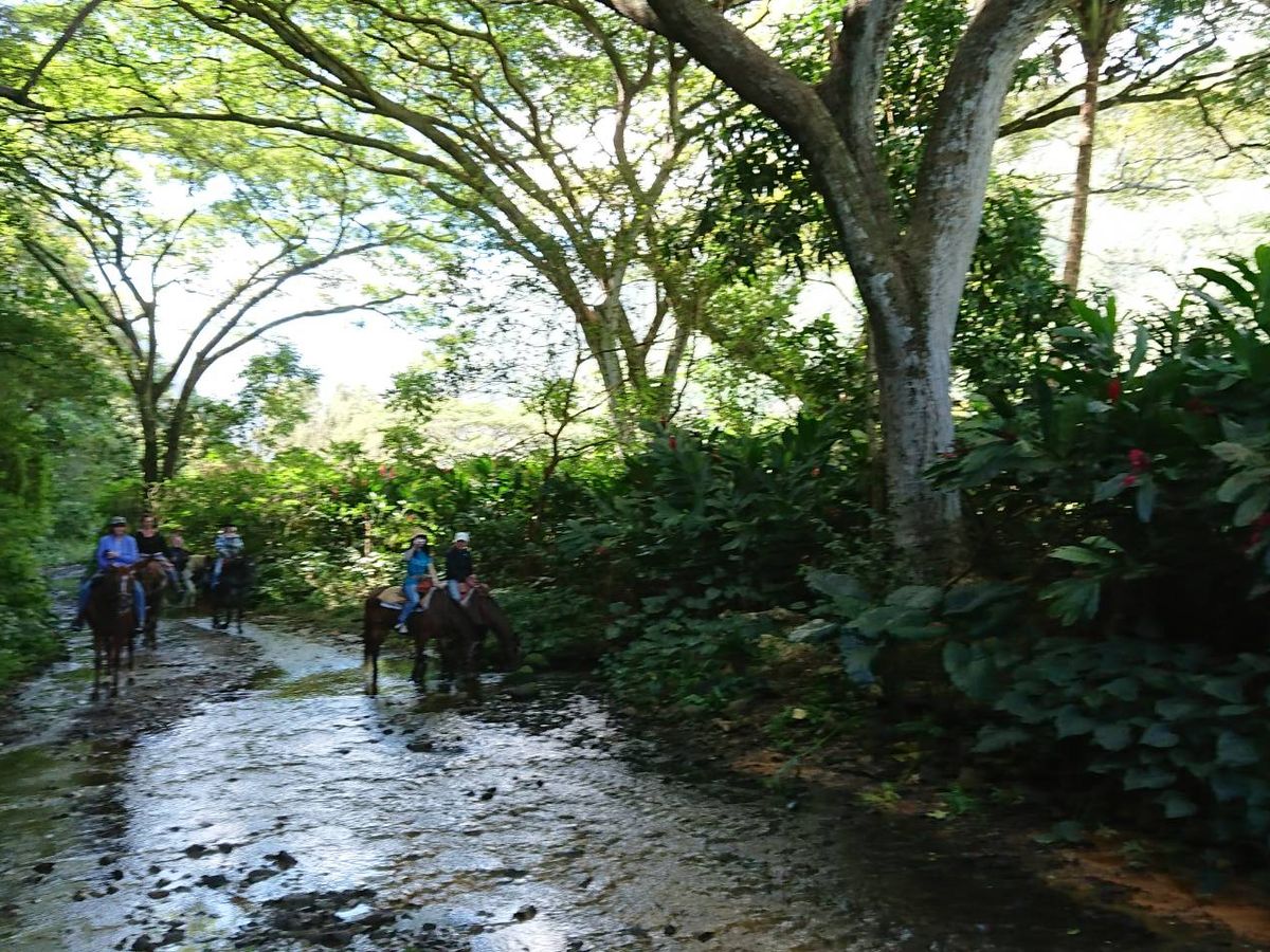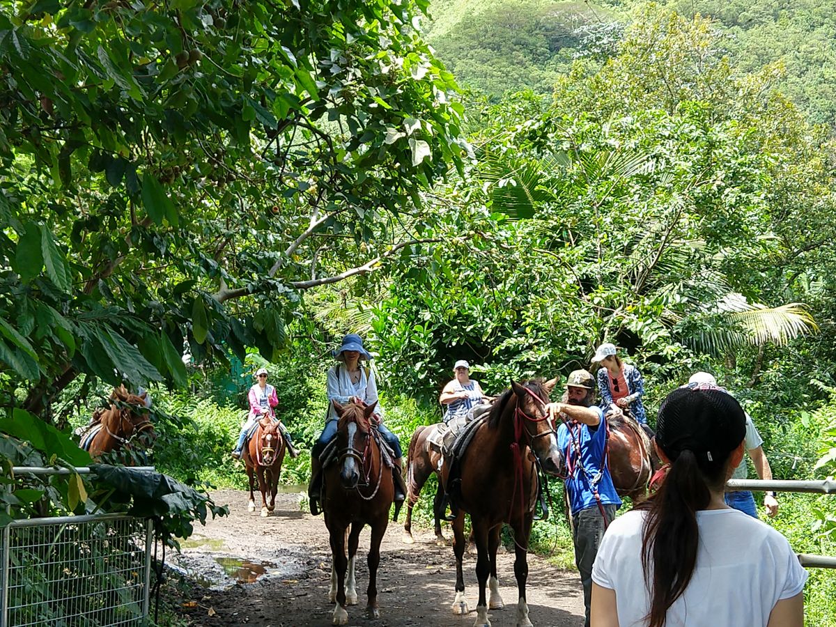 集合場所は、ナビの案内で行けました。そんなに判りにくくはありません。集合時間15分前に着いたら1組が受付を済ませていました。その後、集まり12名のツアーでした。日本人は妻と2名。4駆でワイピオ渓谷まで移動しましたが、展望台から下の渓谷に降りる路は傾斜がきつく且つ路幅も狭く谷側にフェンスはあるものの、運転を間違えれば崖下へ落下の大事故になるリスクがあります。運転席後ろの席の年配おじさんは、後ろを見て解説する運転手に頭をかかえていました。少し怖いです。渓谷に降り、谷底から見るヒイラヴェ滝と渓谷は絶景です。約30分で厩舎のある場所に到着し、乗馬ツアー開始です。馬の乗り方について英語でレクチャーがあり、1人1人に馬をあてがわれます。馬の指示は手綱で行いますが、なんとか判りました。いよいよツアーです。馬もよく調教されていて、連なって進みます。乗馬初めての妻は河を渡る時、馬が水を飲み始め止まって困っていましたが、スタッフのフォローでことなし。渓谷の緑と渓流の中を馬で連なって進むのは気持ちよく、非日常の体験でした。1時間ほどの乗馬体験です。馬から降りたら膝が痛かった。妻はなんともないと言ってました。私は50年前に乗馬経験がありましたが、未経験者でも問題なく乗れるでしょう。おすすめです。