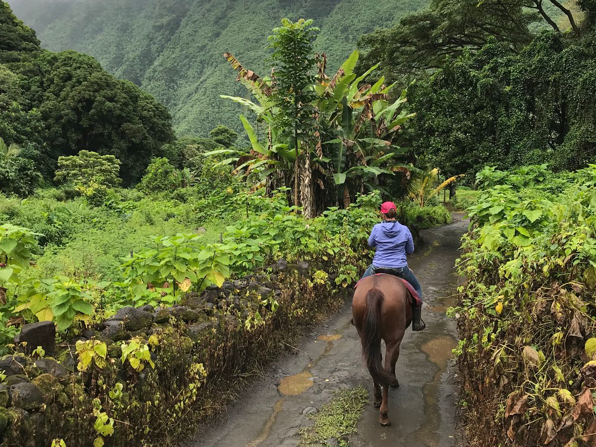 ワイピオ渓谷の谷底を、馬の背に揺られながらの散歩です。豊かな水と緑が印象的な、静謐さをたたえた場所でした。