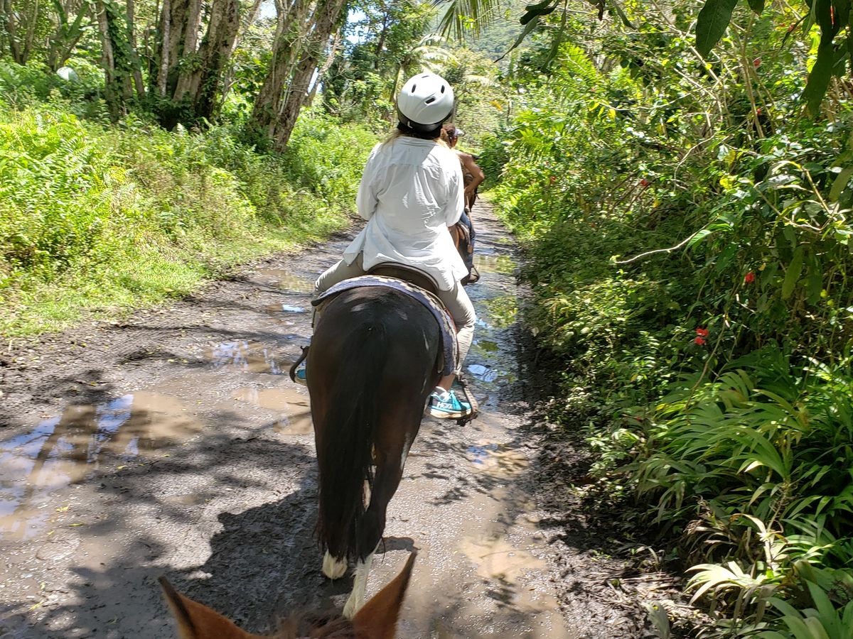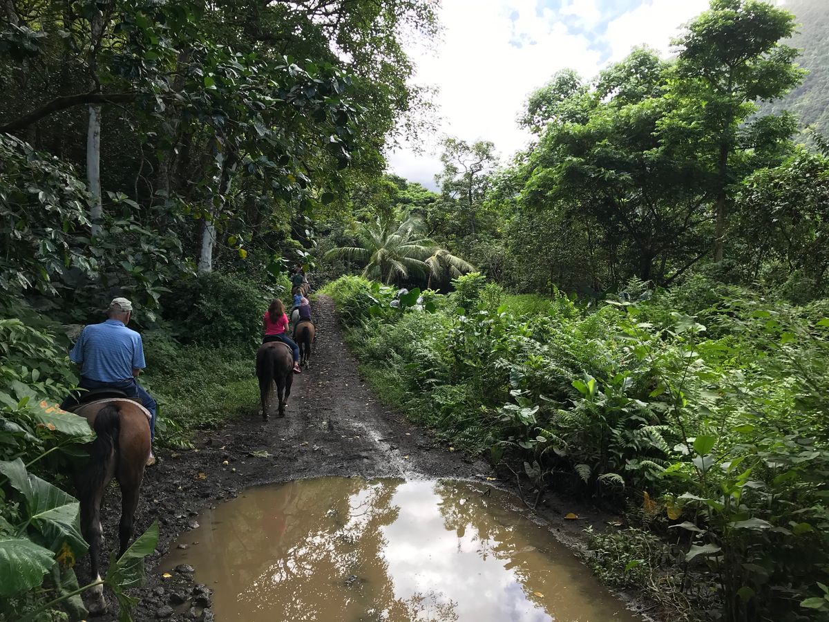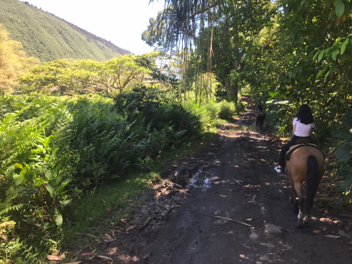 2回目のハワイ島での乗馬、どうしてもワイピオ渓谷に行きたくて夫と参加しました。私は乗馬の経験があるので乗ること自体は問題ないのですが、人数も8人Maxで私たち以外は欧米の方、ガイドの方が植物の説明などしてくださるのが全く分からず残念でした。渓流の中を渡ったり、渓谷の景色の中写真を撮ってくださったり、楽しかったです。川を渡るのはドキドキしましたが、終始歩くのみ。速足、駆足はありません。そういう乗馬は牧場のほうがよさそうです。自分でワイピオ渓谷に行くには、箱根の山のもっと傾斜のきつい坂を歩いて下っていくしかなさそうなので、ツアーの参加がおすすめです。
