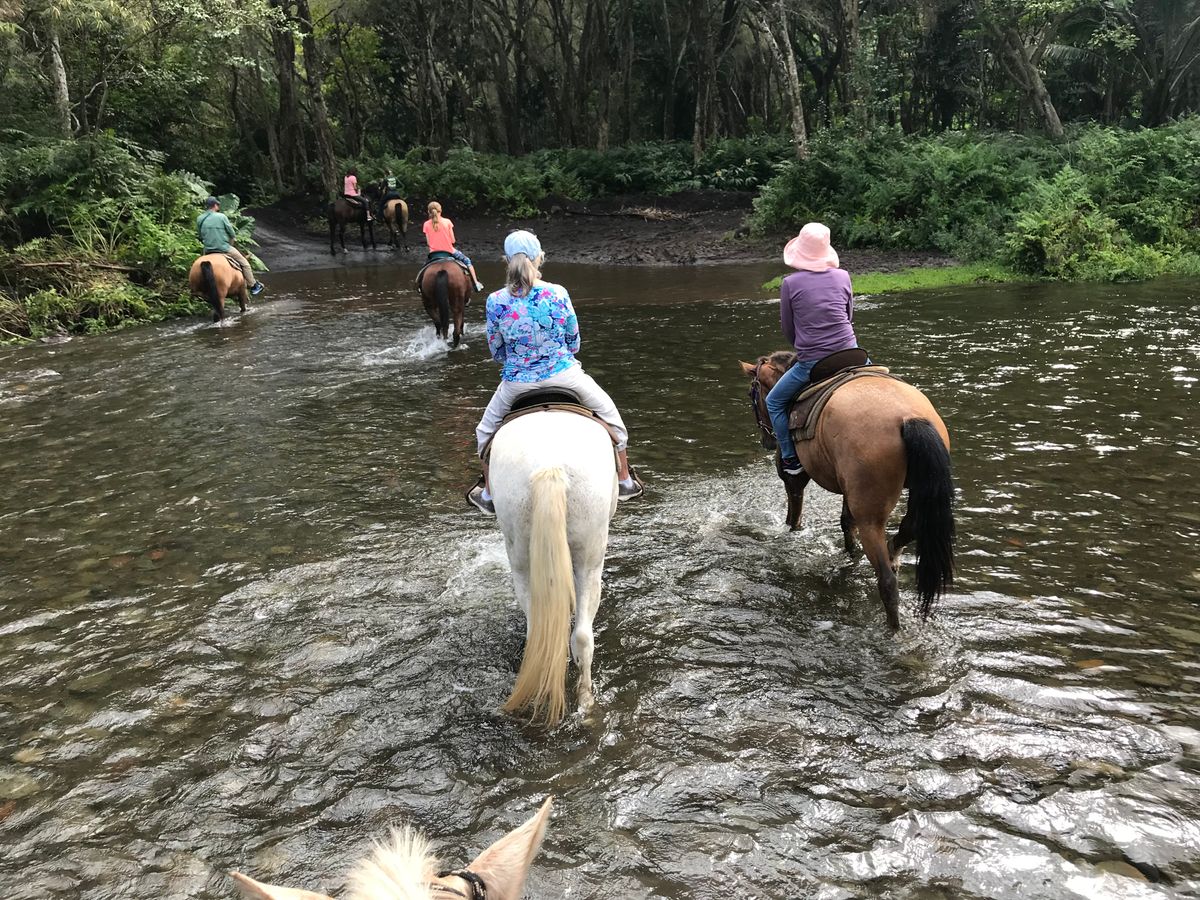 家族で参加しました。8才の息子含め、妻以外初めての乗馬で不安がありましたが、フレンドリーなガイドさんによる、シンプルな英語で楽しむことができました。また、ハワイ島に行った時には参加したいツアーです。タイトルのとおり、乗馬場までも車で急勾配の坂を行き、小川も渡ります。これも楽しめるので、一度で二度楽しめます。