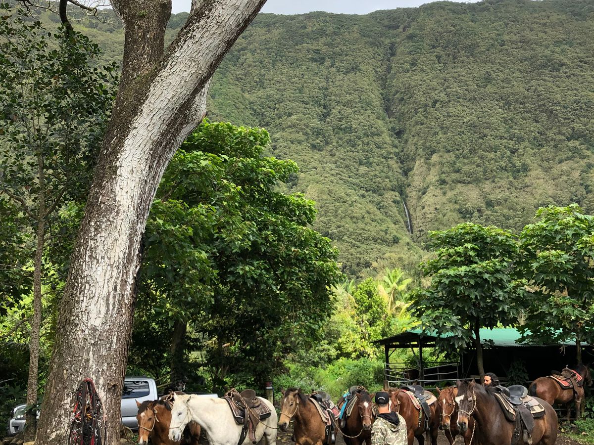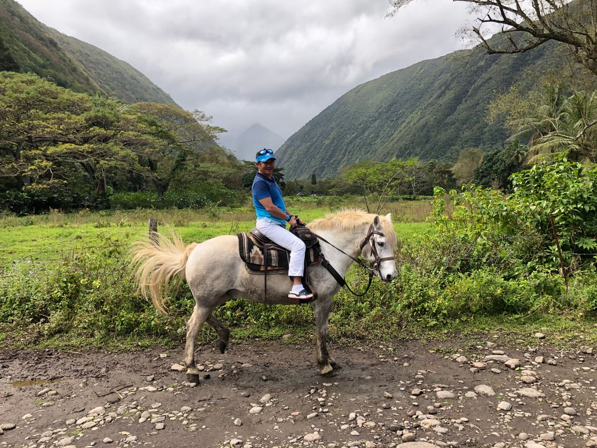 快晴の中、ワイピオ渓谷のレンタカーではとても入って行けないような場所に4WDの車で移動しました。そこで、馬に乗り換え、簡単なレクチャーの後乗馬ツアーに出発しました。車や徒歩ではとても入って行けないような場所を乗馬で巡る夢のような体験ができ、今回のハワイ島で一番の思い出になりました。