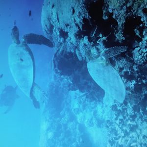 海の深さは恐らく10〜15m位の所で、ウミガメにも会えました!(しかも何匹もいました)魚は、黒い魚と少しシマシマ模様の魚、という感じです。カラフルな感じは期待できないかと。