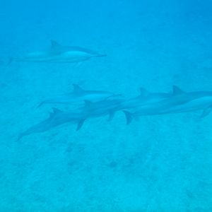We were very lucky that day, encountering pods of dolphins multiple times. When we entered the water at the second point, it felt like we were surrounded by dolphins. While I was swimming away from my husband (with no one else nearby), a dolphin swam right in front of me, and our eyes met... I was so overwhelmed with joy that I shouted, "Yay!" As it swam by, about four dolphins swam together towards the ocean floor, and even now, it feels like a dream.