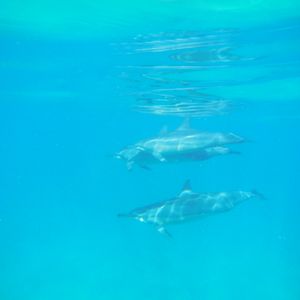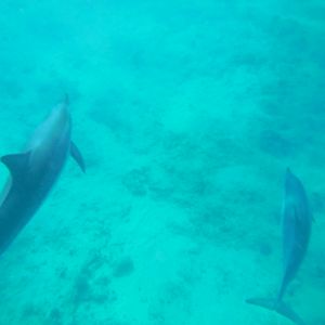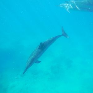 予想外にもすぐにイルカの群れに遭遇し、シュノーケリング開始。生まれて初めて間近で見る野生のイルカたちに感無量…とってもラッキーだったみたいで、こんなにたくさんのイルカたちにすぐに会えるなんて!とスタッフさんたちも皆感動。