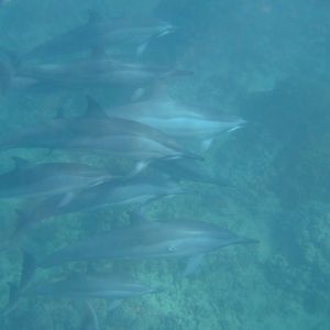 ボートに戻るとイルカの群れが待っていました。そのうちの一匹が私の足を蹴ってきました!ボートの周りには20匹ほどのイルカがいたので、海に飛び込みました。すぐにいってしまったのですが、5分くらいはボートと一緒に泳いでいたと思います。
