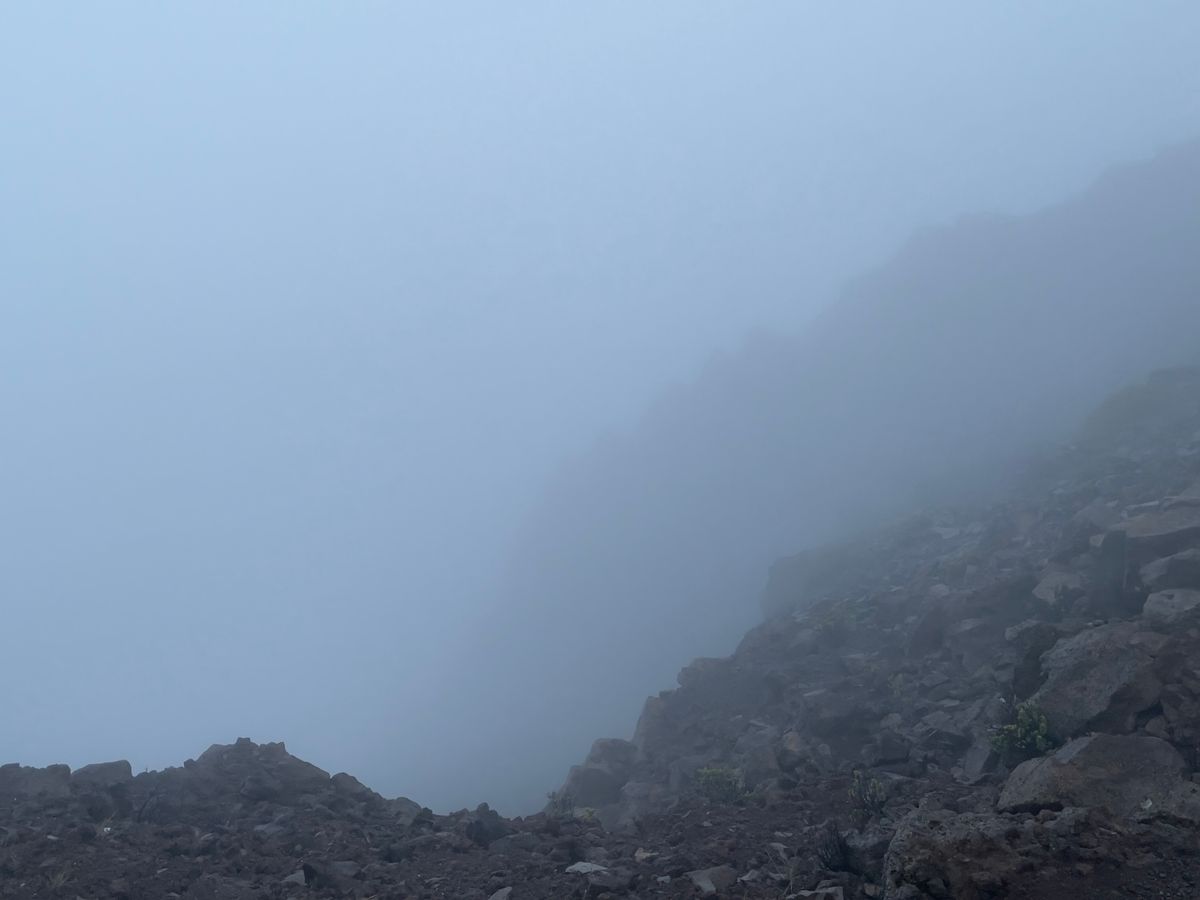 At the summit, the rain and wind were strong, and I couldn't see the crater or the sunset at all. However, the only saving grace was that I saw a very beautiful rainbow along the way.
