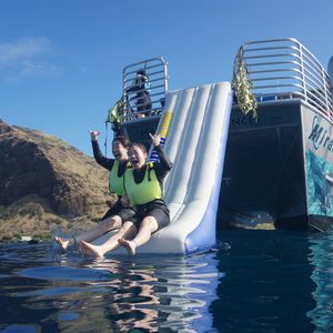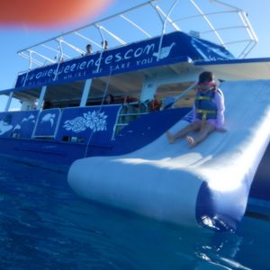 You will be swimming tirelessly to reach the dolphins' location, so it can be tiring. But it's fun. You must have the determination to see the dolphins. Once everyone has seen them, there will be free time with activities like a slide, which is very enjoyable.