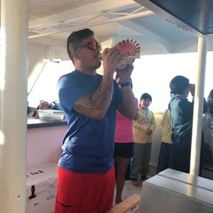 クルーの皆さんも楽しい方ばかりで楽しく過ごすことができました。昼食はチーズバーガーでしたがとても美味しかったです。船酔いの薬は必須です。揺れが少ない日でしたが4人ほどミニバケツを持っていました。
