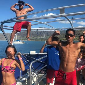 The experience on this trip was amazing. We are avid snorkelers and love the ocean and animals so our expectations were high. The crew was friendly, fun, kind, (even when we had to be reminded of the safety rules because we got a bit excited when we saw the dolphins) professional, talented and explained the rules and safety precautions very well. We saw a large pod of dolphins as we swam in the bluest of water, sighted whales, snorkeled with tropical fish and two turtles and cruised down the gorgeous West coast listening to Hawaiian music. Magical. Group tours have there frustrations because of the number of people trying to see things at the same time but as far as group tours go this was one of the best we have done! We appreciated the Aloha we received from all the crew! You will not regret going on this trip! Mahalo to all the crew and Tommy who greeted us on the docks.