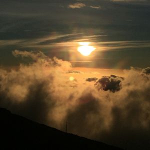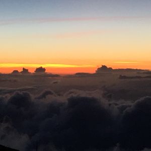 参加者は20名ほど。うち日本人は私たち含め4人でした。ガイド兼運転手は、もちろん英語で(おそらく)ハレアカラの歴史や植物の種類などを説明しながら山頂まで向かいます。到着した時は満天の星空が広がり、流れ星も見えました。(おそらく)サンライズまで時間があるからバスで休んでてもいいよと言われましたが、あまりのキレイさと、どんどん観光客が増えていき写真撮影の場所取りのため、かれこれ2時間寒空の下、日の出を待ちました。残念ながら雲が多く、どこがで光る稲妻がピカッと雲の中からはっきり見えるくらいの天候だったため、朝日は雲に隠れていましたが、雲から覗く赤い光はそれはそれでとてもキレイでした。英語は分からなくても、やっぱり景色はすごい!とても感動しました。