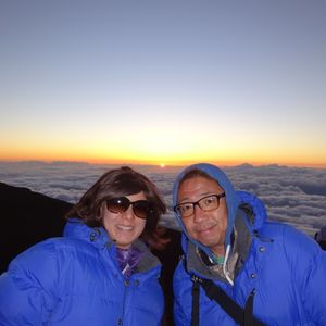 After arriving on Maui, we asked the Japanese staff at the hotel to help us with phone contact. There were about 20 participants, including four Japanese, including us. The guide and driver explained (probably) the history of Haleakalā and the types of plants in English as we headed to the summit. When we arrived, the starry sky was breathtaking, and we could see shooting stars. We were told we could rest on the bus since there was still time until sunrise, but the beauty of the scenery and the increasing number of tourists made us wait outside in the cold for about two hours to secure a good spot for photos. Unfortunately, the weather was such that the sunrise was hidden behind clouds, although we could clearly see flashes of lightning illuminating the clouds. However, the red light peeking through the clouds was beautiful in its own way. Even though we couldn't understand English, the scenery was amazing! We were very moved.