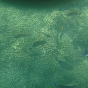Then, we went to the coral reef and enjoyed snorkeling in a place where I couldn't touch the bottom. Many fish welcomed us, and it was fun.