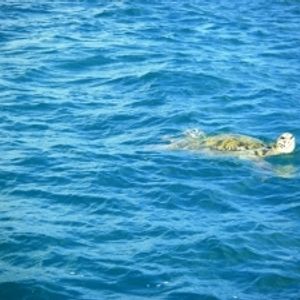 最初は現地スタッフが海亀を見つけては指を指して方向を教えてくれたのですが、中々見つける事が出来なかったのですが、時間が経つにつれ海亀を見つける事が出来る様になって来ました。暫くすると、船の周り360度、海亀だらけと言う状況で大感激でした。次回はワイフと共に参加したいと思います。エリさんとのツ−ショットの写真は宝物です?